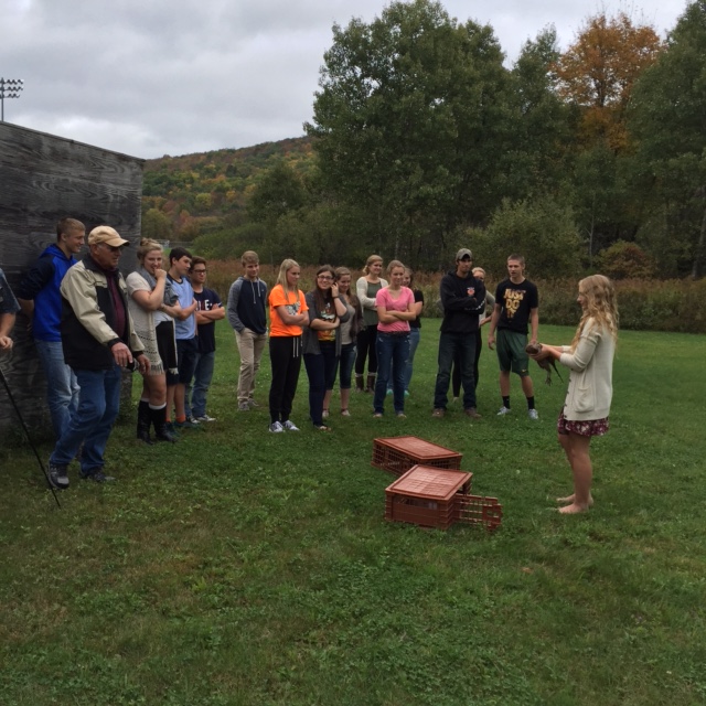 Students of Scott Jordan's Outdoor Education class at the Cuba-Rushford school get some hands on time with pheasants donated from the pheasant program for education.