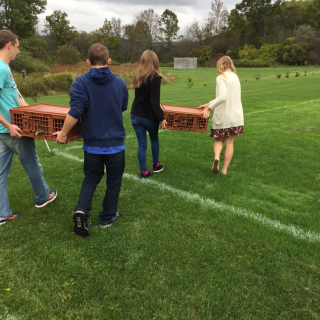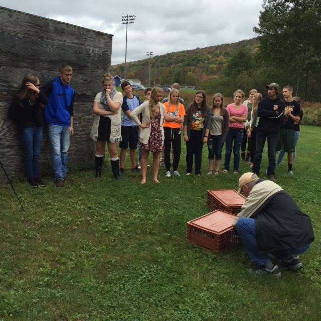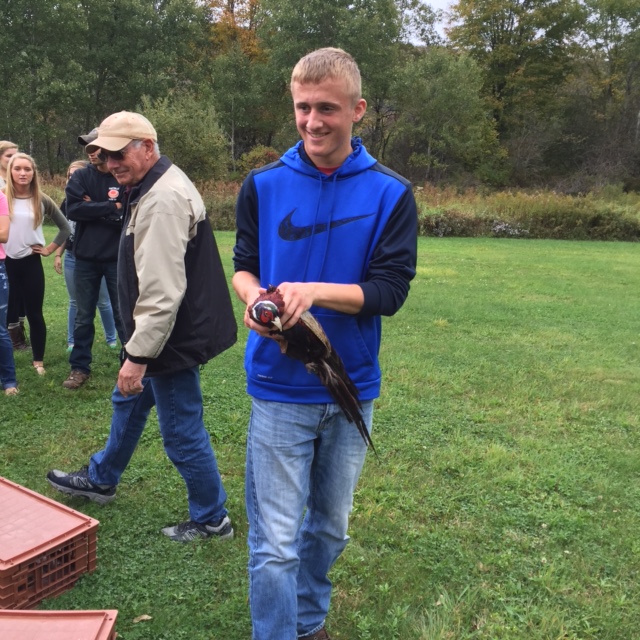Students of Scott Jordan's Outdoor Education class at the Cuba-Rushford school get some hands on time with pheasants donated from the pheasant program for education.